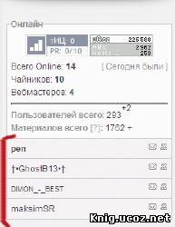 Описание: Новый симпотный вид кто онлайн для ucoz Установка: Ставим в блок куда вам надо данный ниже код: Code <div style="margin:-5px; margin-top:5px; padding:0px; border-top:1px solid #ccc; background:#f3f3f3; max-height:160px; overflow:auto; overflow-x:hidden;" id="userList"> <div style="clear:both"></div> </div><script type="text/javascript"> $.get('/index/62',function(e){ fuu =